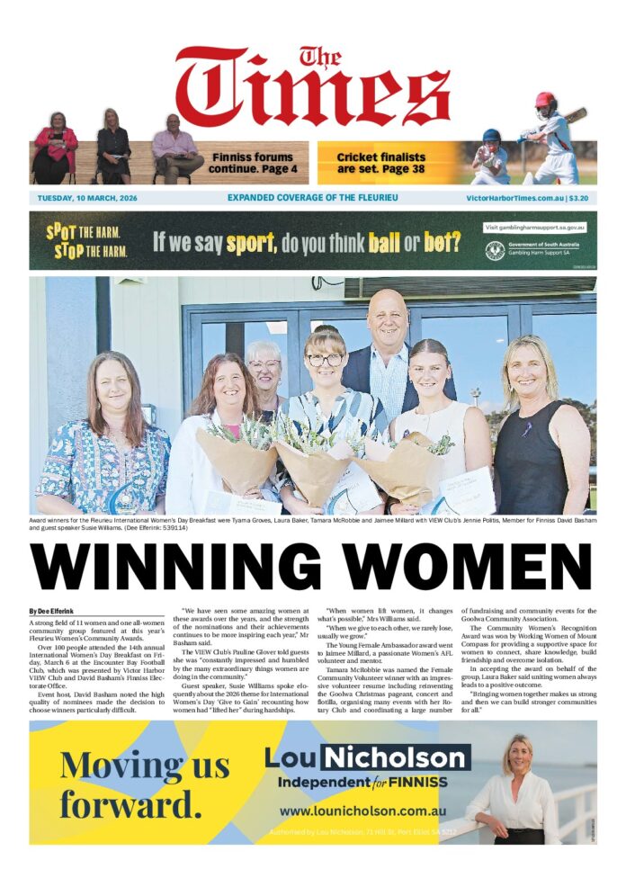 The Victor Harbor Times – 10th March 2026 Subscribe or Login to see the rest of the content. Username Password * Remember Me Forgot Password News Knockout finals weekend 10/03/2026 The minor round is done and six teams are still alive in the quest for the Great Southern Cricket Association A Grade Premiership. This Saturday... Senior basketball Results 10/03/2026 Division 1 Women Lakers Bye Magic ‘1’ 41 Draw Celtics 41 Top points scorers for Magic were Annabel Cameron on 11 points and Jordyn Stock on 10... Junior basketball results 10/03/2026 U12 Boys Div 1 Magic Bye Pistons ‘2’ 39 Def Lakers 20 Top points scorers for Pistons were Aden Hentschke on 22 points and Sam MacPherson on...