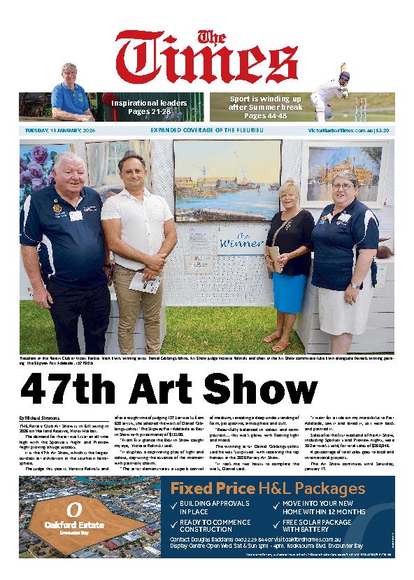 The Victor Harbor Times – 13th January 2026 Subscribe or Login to see the rest of the content. Username Password * Remember Me Forgot Password News Fleurieu helps Fred 01/03/2026 The South Australian regions of Alexandrina, Yankalilla and Onkaparinga were the top donors to an acclaimed international eye sight foundation. Collectively, the Fleurieu communities have... Liberals make PATS promise 01/03/2026 An announcement by the Liberal Party would seen a raft of changes to the Patient Assistance Transport Scheme (PATS), if a Hurn Liberal Government... Get into Reading with the Victor Harbor Library 01/03/2026 There are many benefits that come from a healthy reading habit but research by Creative Australia shows that 54.9 per cent of Australians want...