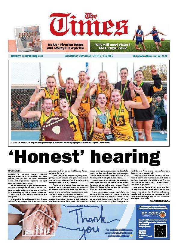 The Victor Harbor Times – 16th September 2025 Subscribe or Login to see the rest of the content. Username Password * Remember Me Forgot Password News Zonta movie night 05/12/2025 Zonta Club of Fleurieu Peninsula hosted a movie night at the Victa Cinema on Monday, December 1 as part of the '16 Days of... Fire burns through grass, hay bales near Inman Valley 05/12/2025 A fire has burnt through about three hectares of grass and hay bales near Inman Valley and Ball Hills, causing a significant level of... Flautist to perform 05/12/2025 Internationally acclaimed flautist Mardi McSullea is set to perform in Victor Harbor, providing a rare chance to experience a world-class musical performance. McSullea, one of...