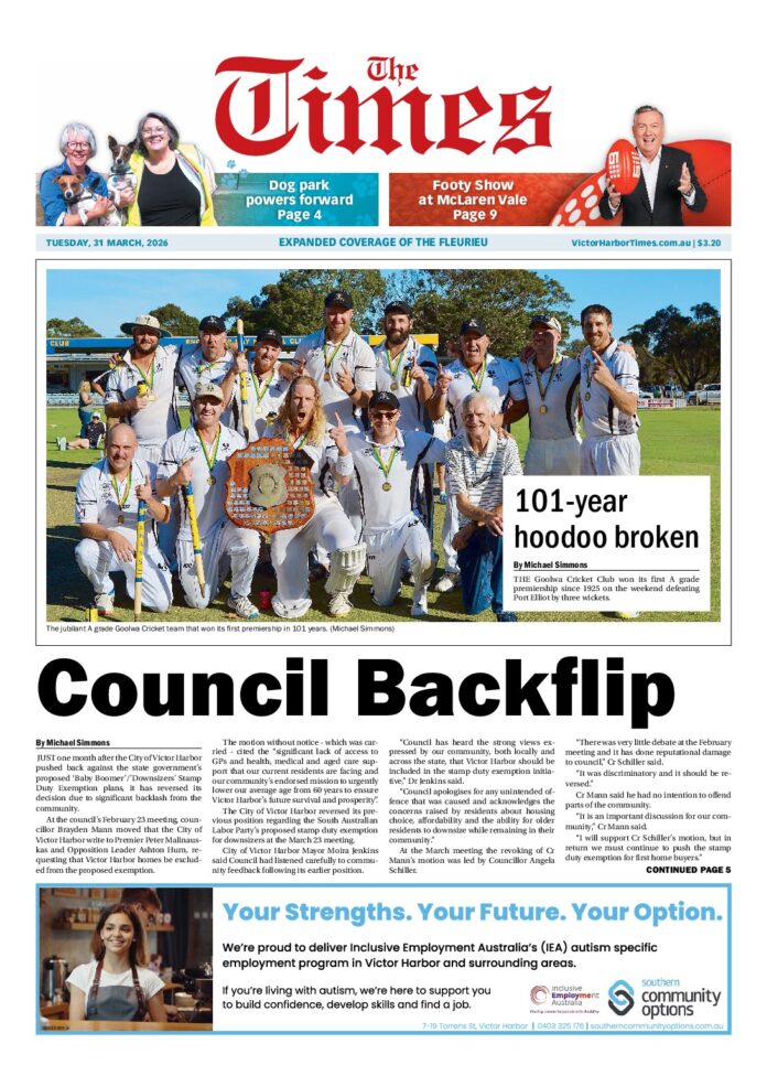 The Victor Harbor Times – 31st March 2026 Subscribe or Login to see the rest of the content. Username Password * Remember Me Forgot Password News Happiest quiz night ever 04/04/2026 The happiest quiz night in town is all set to raise the roof, as well as much needed funds, with music, prizes, giveaways and... State champ success 04/04/2026 The Fleurieu region was represented by two dragon boat clubs at the 2026 State Championships on Sunday, March 29, bringing home medals galore in... More GSABA Junior Runners Up 04/04/2026