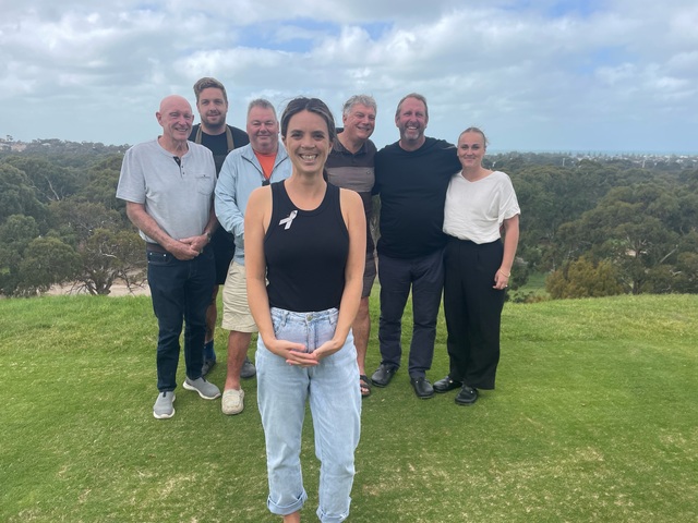 At the first tee of the Victor Harbor Golf Club are organisers of the cancer awareness fundraiser on April 13 - John Gilbert, Sam Basham, Ray Duncan, Peter Rix, Simon Pitman, Flo McLaren and at front is Catie Griffen. (Michael Simmons 469111_01).