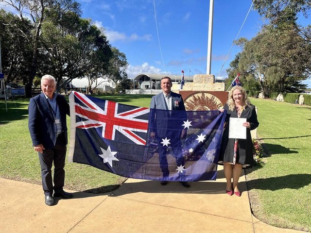 Alexandrina Council Mayor Keith Parkes, Goolwa RSL President Ray Woods, and Member for Mayo Rebekha Sharkie with the flag flown at Parliament House. (Supplied)