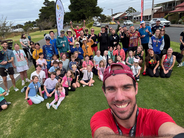 Owen Cruickshanks-Boyd with a group of runners in Goolwa, who took part in the Indigenous Marathon Foundation virtual run in June 2024. Photo: Supplied