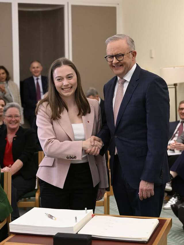 Senator Charlotte Walker is congratulated by Prime Minister Anthony Albanese after signing the ALP Caucus book on July 21. (Instagram/senatorcharlottewalker)