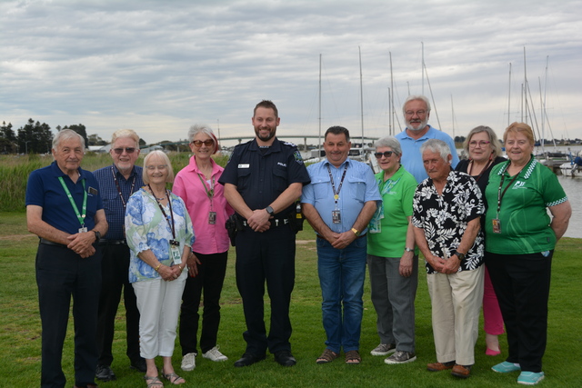 Goolwa Neighbourhood Watch members Mal Salter, Tony McWhinney, Pat Salter, Debbie Smith, Senior Sergeant Darren Parker, Eddy Mignanelli, Morag Barker, Stan Wood, Tony Siciliano, Bronwyn Lewis and Lorraine Mc Donnall at Snr Sgt Parker's farewell. (Dee Elferink: 514230_12)