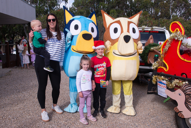 Beau, Callie-Ann, Lyla, and Huxley Evans, of Tooperang, meet Bluey and Bingo at the Mount Compass Christmas event on Sunday, December 14. (Dani Brown: 525398_01)